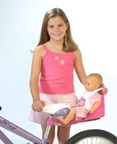 "Dolly Come Ride With Me Doll's Bicycle Seat - Finally! A girl doesnt have to leave her doll at home when she goes for a cool bike ride in the neighborhood. Now, beloved dolls and stuffed animal toys can travel along for the ride. A mom with a daughter of her own, has invented a safe and fun way for dolly to ride with you. A bicycle seat designed just for dolls or favorite stuffed animals. Detachable, so that as you grow, your dolly can go! Be the first in your neighborhood to own Dolly, Come Ride with Me! * Detachable doll seat for bicycles * Easy attachment to seat post of bike ( with bigger bikes seat post may need to be raised for safe clearance over back tire) * Adjustable Velcro straps to hold doll or stuffed animal snugly in place * Doll seat holds most dolls or stuffed animals 18"" - 22"" in length and dolls less than 3 lbs. * Reflector tape placed on rear of seat to increase visibility * Heart cutouts in rear of seat so water will not puddle if left out in the rain * Safety designed to allow only your dolls and stuffed animals to go along for the ride! * Fun pink color designed to coordinate with today's girls bikes!"